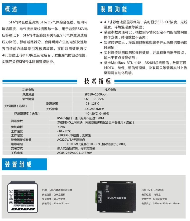 SF6气体在线监测集 SF6/O2气体综合在线、柜内环境温湿度、电气接点无线测温与一体,用于监测35KV电压等级以下,SF6气体断路器开关柜因SF6气体泄漏造成压力降低,影响断路器分、合闸瞬间产生的电弧快速熄灭而造成绝缘降低引发短路故障。实时监测数据通过485总线上传DTU传至远程后台,发生漏气时自动报警,实现开关柜SF6气体泄漏智能监控。