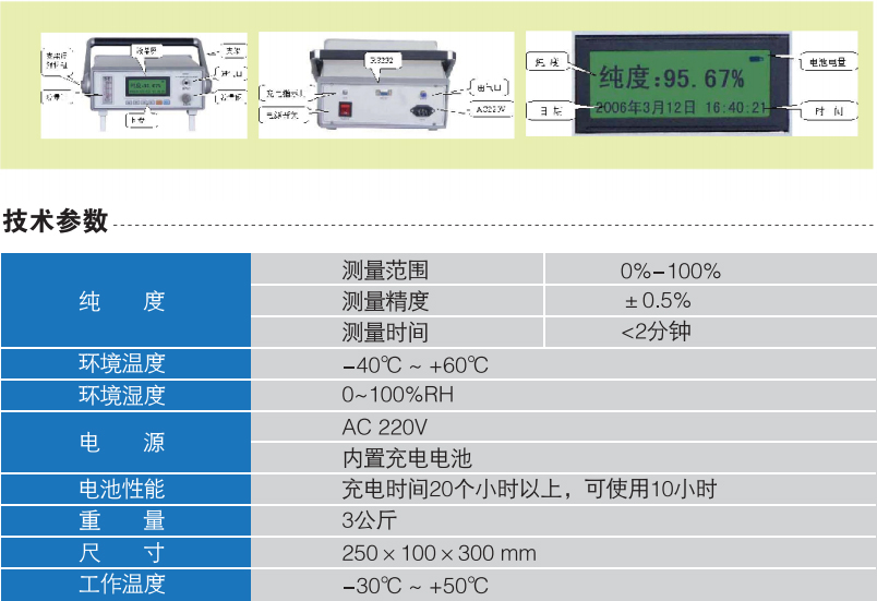 6.显示清晰:液晶屏直接显示纯度值、时间及日期、电池电量等内容。
