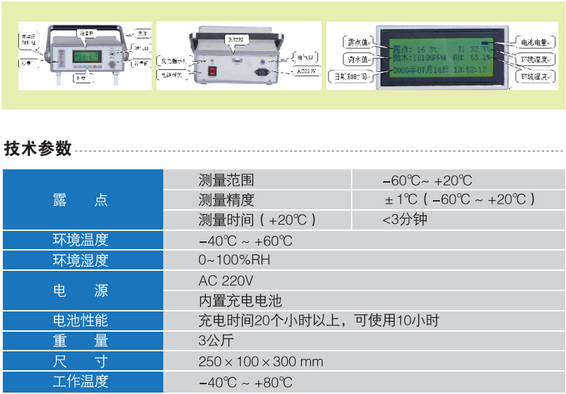 5.显示清晰:液晶屏直接显示露点、微水( ppm)、环境温度、环境湿度、时间及日期、电池电量等内容。